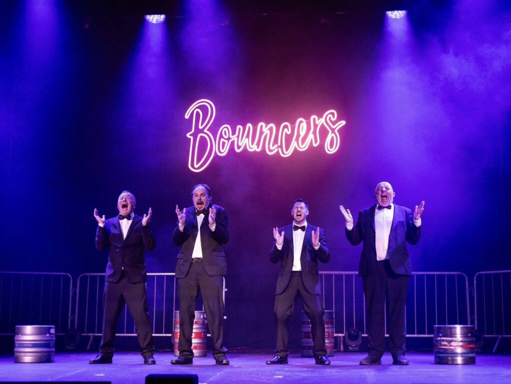 Trio Entertainment Ltd pull out the stops with their production of Bouncers, John Godber’s classic 1977 play covering an evening working the doors of a nightclub for four bored doormen and their likely clientele: four young beer swilling lads hoping to get lucky and four excitable teenage girls out for a bit of dancing, drinking, and whatever the eye might fancy, including visits to the hairdressers and fast food vendors.