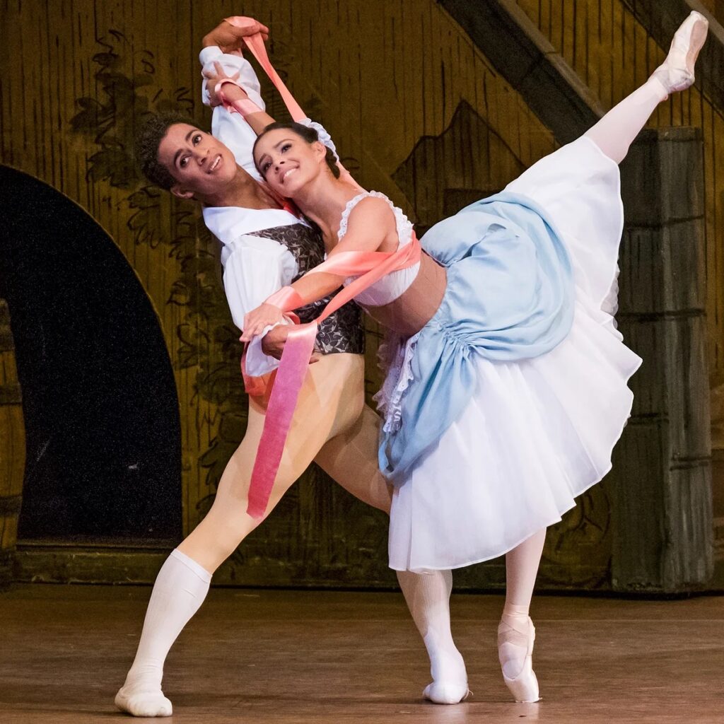 Hayward’s performance is exquisite as she performs with a permanent veneer of naïve charm and innocent vivacity capturing the hopeful anticipations of a beautiful teenager with the world at her feet whilst still cheeky enough to outwit the machinations of her interfering mother. Sambé is the local heart throb down to a tee with his muscular physique embraced in his every swagger, but his actions show him to be very much more the hero rather than simply pure machismo. Combined the pair delight, most strikingly in the series of energetic pas de deux that perfectly express their youthful passion, and which shows them destined to be together, embellished further by the natural chemistry the pair share: definitely a partnership to watch out for.
